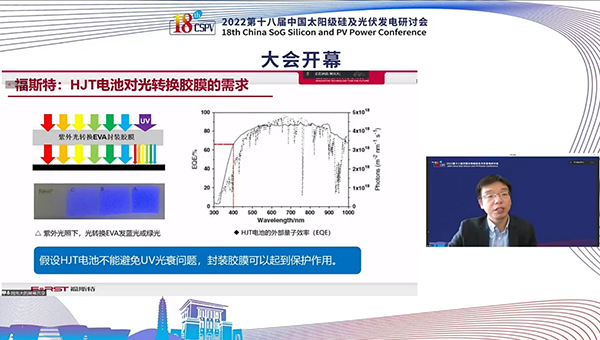 2022年12月8日至10日,第十八屆中國太陽級(jí)硅及光伏發(fā)電研討會(huì)(18th CSPV)在山西太原舉行。本次會(huì)議采取線上論壇的形式召開,福斯特等光伏企業(yè)協(xié)辦。在會(huì)議首日主會(huì)場論壇中,福斯特總經(jīng)理周光大博士針對(duì)光伏市場主流的新電池技術(shù)闡述了福斯特的理解,提出了專業(yè)的解決方案,并做了題為《新型高效電池的封裝方案》的報(bào)告。