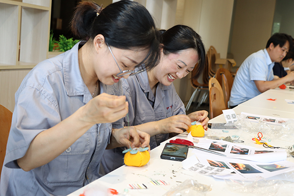 萋萋苦艾納香囊,傳承千年未泯香。我國自古就有端午佩戴香囊的傳統(tǒng),清香的艾葉有避邪驅(qū)瘟、醒腦提神的功效,也有“招百福”的美好寓意。員工們自己動手縫制柿子形狀的香囊,象征“柿柿如意”,大家全神貫注,穿線、縫制、收口、定型,一個個可愛的小柿子就在手中誕生了。