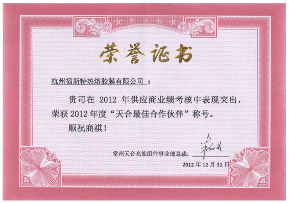 2012年度,福斯特在天合光能供應商業績考核中表現突出,榮獲2012年度“天合最佳合作伙伴”稱號。