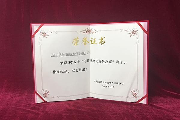 福斯特榮獲2016年度無錫尚德優質供應商獎