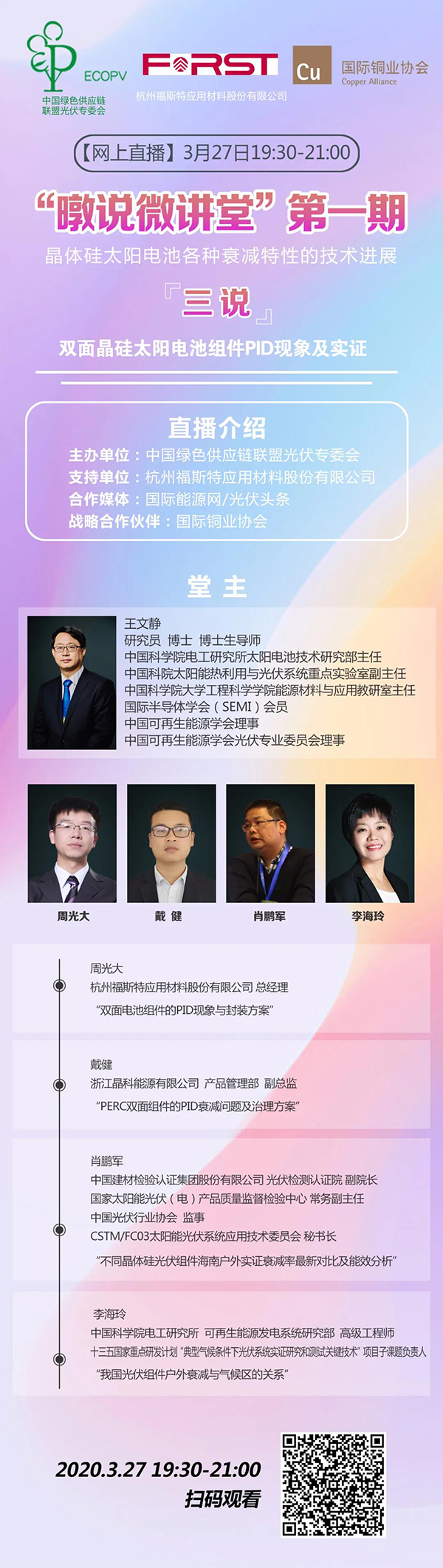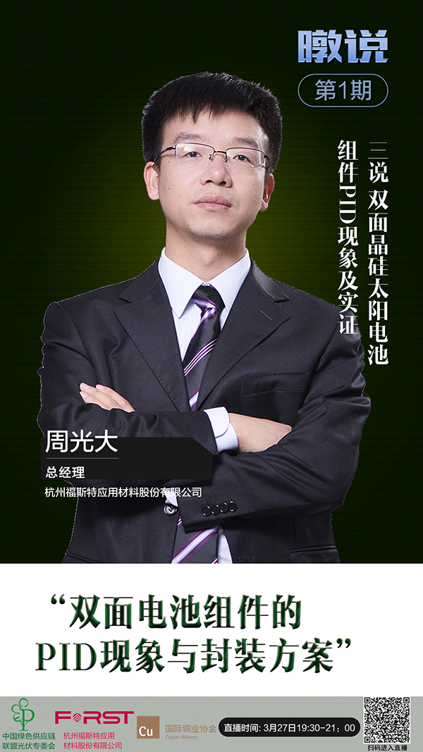 中國綠色供應鏈聯盟光伏專委會(ECOPV)線上課堂“暾說微講堂”第一期將于3月27日開啟。福斯特總經理周光大應邀發表“雙面電池組件的PID現象與封裝方案”主題演講。