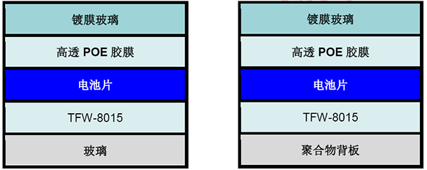 在雙玻組件中應用的封裝結構                                 在單玻組件中應用的封裝結構